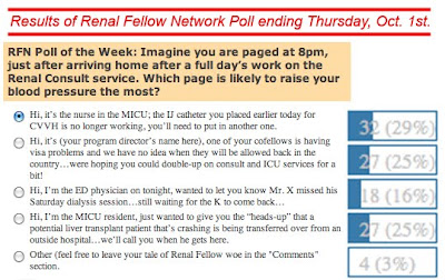 The readers of the Renal Fellow Network have spoken, and the answer is clear: the most blood pressure elevating activity is catheter-related! 29% of fellows selected the first answer (the MICU nurse paging you to inform that your IJ catheter is malfunctioning), with the second answer (your program director asking you to pick up the slack by double-covering services) coming in a close second at 25%. Thanks for voting and be sure and make your voice heard in our latest Poll of the Week on the right.