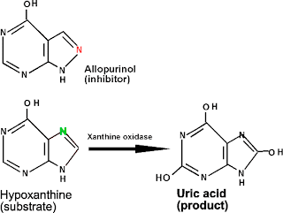 1. allopurinol effect: allopurinol is an inhibitor of xanthine oxidase, the rate-limiting step in the synthesis of uric acid. Thus, allopurinol is a common cause of hypouricemia, though rarely does it cause a complete loss of uric acid synthesis.