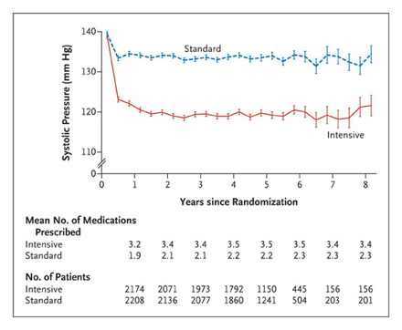 • Patients were assigned to intensive BP control (target SBP less than 120) or standard BP control (target SBP less than 140)