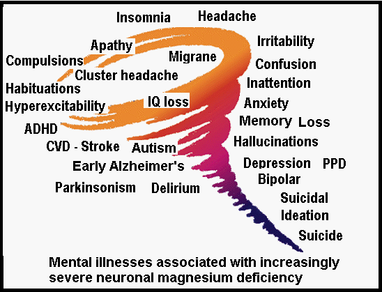 Clinical signs of hypomagnesemia (from mild to severe) include loss of appetite, nausea/vomitting, fatigue, weakness, numbness, tingling, muscle contractions/cramps, seizures, nystagmus, personality changes, hypokalemia, hypocalcemia, arrhythmias and coronary spasms.