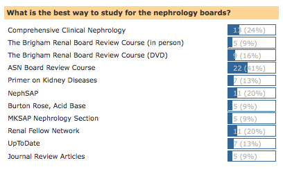 The results are in. Looks like the best way to study for the nephrology board exam, scheduled to be given on November 4th, 2010, is the ASN Board Review Course. I personally did not attend this course last year, but I did hear very good things about it. Comments from a course attendee- “it was focused, organized and worth the money”. By no means is this course cheap. For fellows-in-training it cost $975 to register for the week long course (held August 28th-September 3rd, 2010). Not to mention the plane ticket to San Francisco and “special” hotel rate of $234 a day. Adding in miscellaneous costs (food, taxi etc) and this trip could cost you well over $2800. Add this to the outrageous fee of $2060 to take the nephrology boards and you can see why you don’t want to take this test twice. So, for anyone interested, prepare to shell out $2,800.- You can access all of the old powerpoint presentations on the ASN website for free.