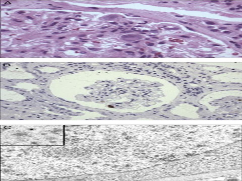 Others reported different types of lesions like cryoglobulinemic necrotizing GN or immunotactoid glomerulopathy. The association in those cases were made based on temporal relationship between the appearance of CMV antigenemia and the lesion.