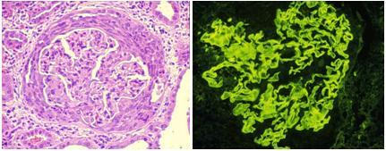 Given the worsening renal function, a transplant biopsy is immediately performed. The light microscopy and immunofluorescence appear below: