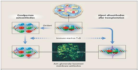 Approximately 3-5% of patients with Alport’s syndrome develop de novo anti-glomerular basement membrane (GBM) disease in the transplanted kidney. Alport’s syndrome is a genetic disorder that results from mutations in the genes encoding the alpha-3, alpha-4, or alpha-5 chains of type IV collagen. Following transplantation, recipients can become alloimmunized and develop antibodies to the normal chains of type IV collagen in the basement membrane of the donor kidney (hence, the linear pattern of staining noted on IF). Treatment is not standardized, but generally consists of plasmapharesis, +/- cyclophosphamide and steroids. Long-term allograft survival is poor and re-transplantation carries a high risk of anti-GBM recurrence. For the boards, remember the post-transplant association between Alport’s syndrome and de novo anti-GBM disease.
