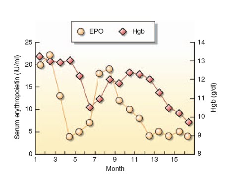 Interestingly, analogous to patients with newly diagnosed type 1 DM who commonly experience a sharp reduction in their insulin requirement after initial presentation, there appears to be a similar “honeymoon period” after initial presentation with renal anemia, during which the hematocrit stabilizes or even increases (see figure) without treatment. An explanation may be that CKD patients presenting with an acute event such as infection may experience an abrupt, transient, decline in serum erythropoietin levels, and worsening of anemia. As they recover from the presenting event, serum erythropoietin levels and Hgb may also improve. However, this improvement would be masked in patients already initiated on maintenance outpatient Epo.