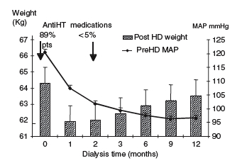 8. Weight falls rapidly after initiating dialysis due to saline removal. However, as a rule of thumb, weight should return to pre-initiation levels after 1 year on dialysis due to muscle and fat build up, with BP now under control (see figure).