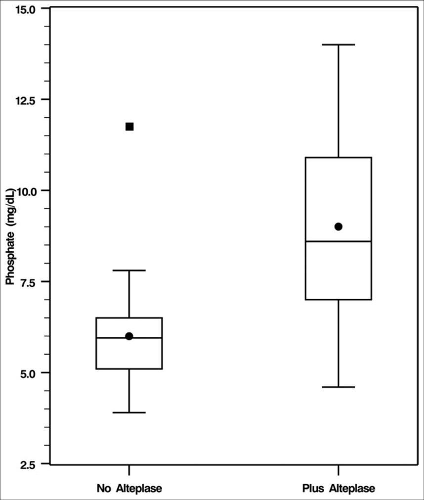 An 83-year-old woman with ESRD was having occasional trouble with her dialysis catheter and had intermittently required alteplase-locking. She had been on a stable dose of PO4 binders and her PO4 was very well controlled. However, at one of her visits, her PO4 was noted to be 10.1 (previously 3.5-5) with no change in her diet and the following month it was 35.7mg/dl. Her labs were taken in the usual fashion, after discarding this first 5mls from the catheter. It was postulated that the alteplase might be interfering with the assay for PO4.