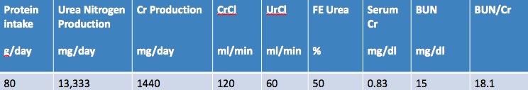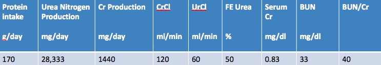 If you almost double the protein intake you almost double the BUN (from 17 to 33 mg/dl). Now let’s try the stopped eating, 1 liter bleed scenario along with a 50% drop in GFR due to hypotension. Remember that in the volume depleted state the fractional excretion on urea is typically less than 35% and for arguments sake we’ll make it 20% in our man.