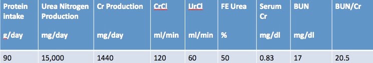 Consider a 72kg male in steady state eating 90grams of protein per day with a creatinine clearance of 120ml/min and a Urea clearance of 60ml/min.
