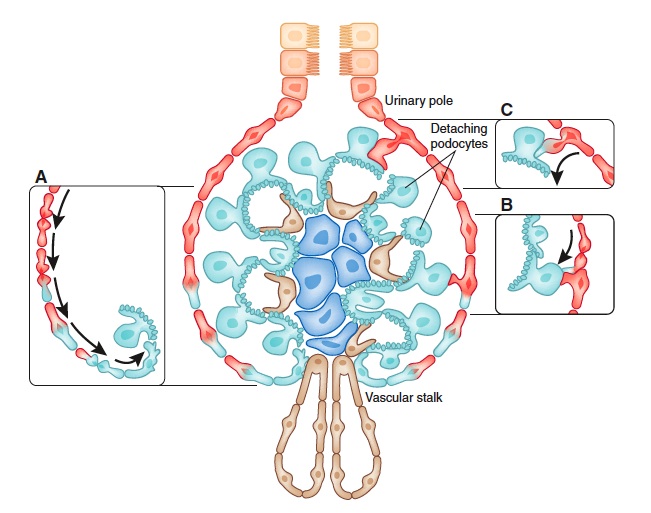 Suggested mechanisms of podocyte replacement are also shown with A) progressive differentiation down Bowman’s capsule to the vascular stalk B) direct bridging by adjacent progenitor cells C) bridging by glomerular epithelial stem cells that subsequently acquire podocyte markers.