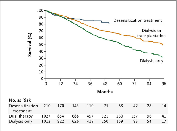 Overall, major adverse events during desensitization treatment occurred in less than 5% of patients, including anaphylaxis or bleeding. The most common cause of death was cardiovascular disease (~16% patients) and there were 6 deaths related to infection (~3%), which were likely secondary to the intensive immunosuppression produced by the desensitization protocol. In summary, sensitized patients can obtain a significant survival benefit by undergoing desensitization followed by kidney transplantation compared to alternative options, but risks of infection are higher and more studies are needed to help identify patients at greatest risk of dying and suffering from complications like malignancy or cardiovascular disease.