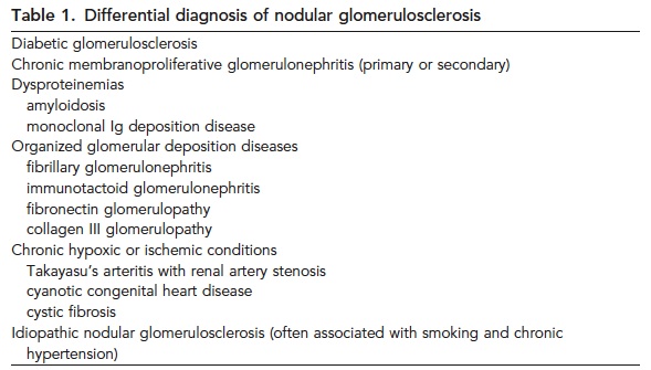 The predominant pattern seen on light microscopy in HCDD is nodular glomerulosclerosis and of note all the cases of IgA related disease additionally had crescents. Nodular glomerulosclerosis has its own interesting differential diagnosis that has been previously reviewed on RFN. Check out the nice table below on the subject from JASN.