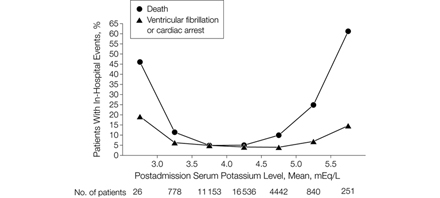 It was not an unusual event during my clinical fellowship to get a call from the cardiac team asking for dialysis in a patient with hyperkalemia and acute renal failure. On a few occasions the hyperkalemia seemed disproportionate to the level of renal function and on further investigation, this was found to the as a result of the zealous correction of the potassium level to >4 mEq/L in patients in the cardiac unit. I have often wondered about this practice and whether or not there was firm evidence for keeping the potassium in the 4-5 mEq/L range (or even 4.5-5.5 as suggested by some authors) and so it was with interest that I read this paper that just appeared in JAMA. As mentioned in the paper, the data suggesting that low potassium levels are associated with increased mortality are relatively old and date from an era when ventricular arrhythmias were more common following an MI. They were also generally relatively small studies. The authors of this study used a database of patients presenting to 67 US hospitals with an ICD9 code for MI and increased cardiac biomarkers. In total >39,000 patients were included. They were looking primarily at post-admission potassium levels and their relationship with in-hospital mortality and the occurrence of arrhythmias. AS one would expect, there was a U-shaped curve for the relationship between in-hospital mortality and the potassium level. What was unexpected, however, was that the lowest mortality was seen in patients with a potassium between 3.5 and 4.5 mEq/L and that the mortality doubled in patients with a potassium between 4.5 and 5 mEq/L.