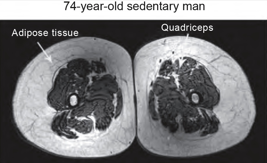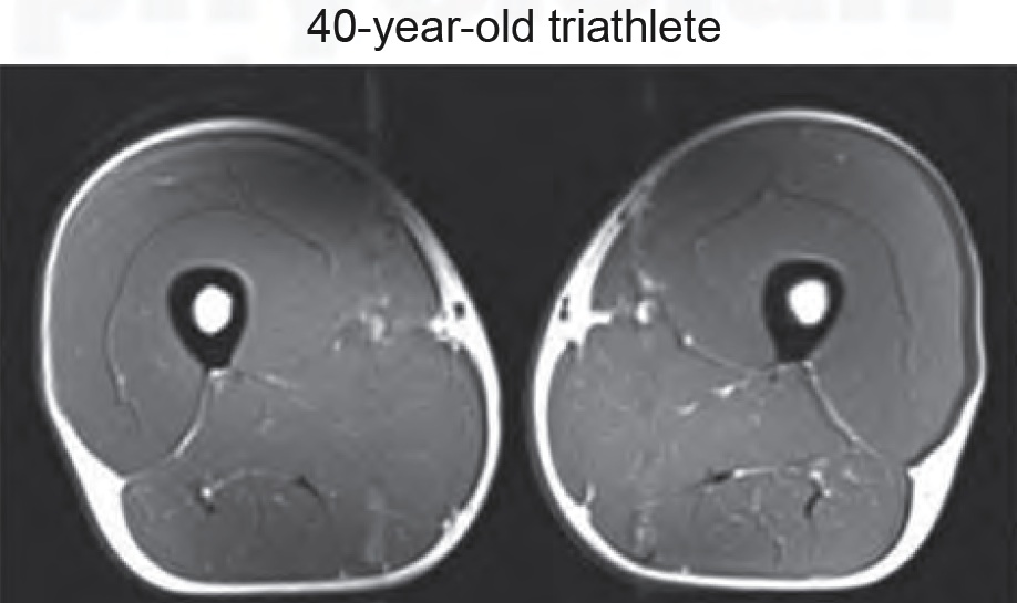 In these individuals muscle mass and function did not decline with age though they did gain body fat. Compare the muscle area and appearance of the 74 year old sedentary male above to the 70 year old male athlete below…
