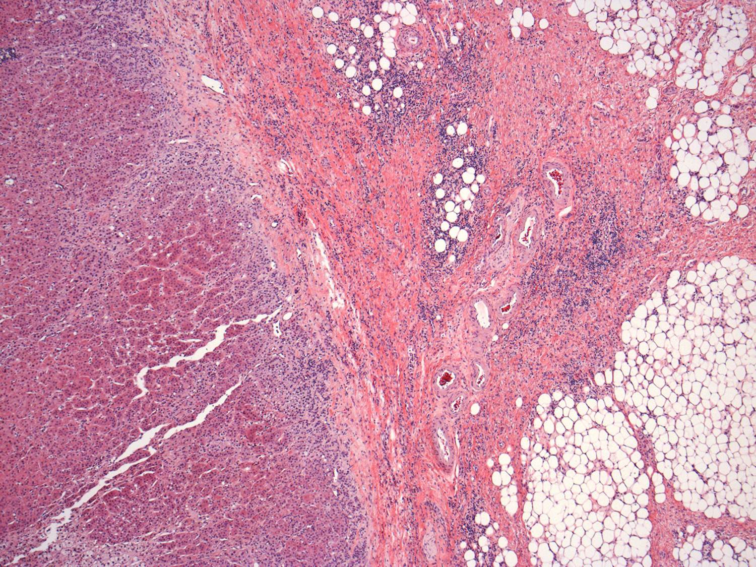 The adrenal gland was essentially normal apart from some focal inflammation and adhesion to the capsule. There was no evidence of any malignancy and it is likely that the changes seen were a result of infection which had resolved by the time of the surgery.
