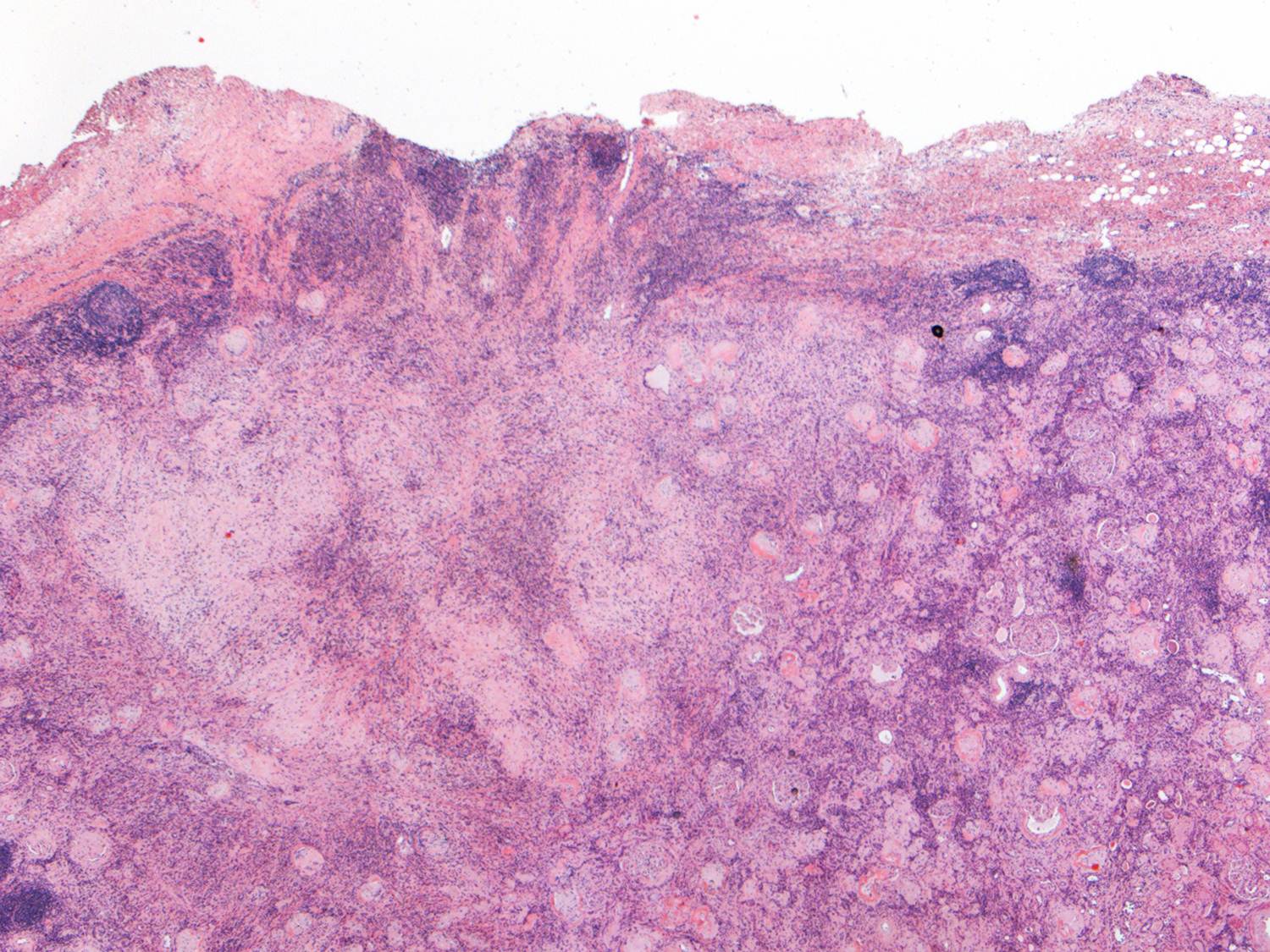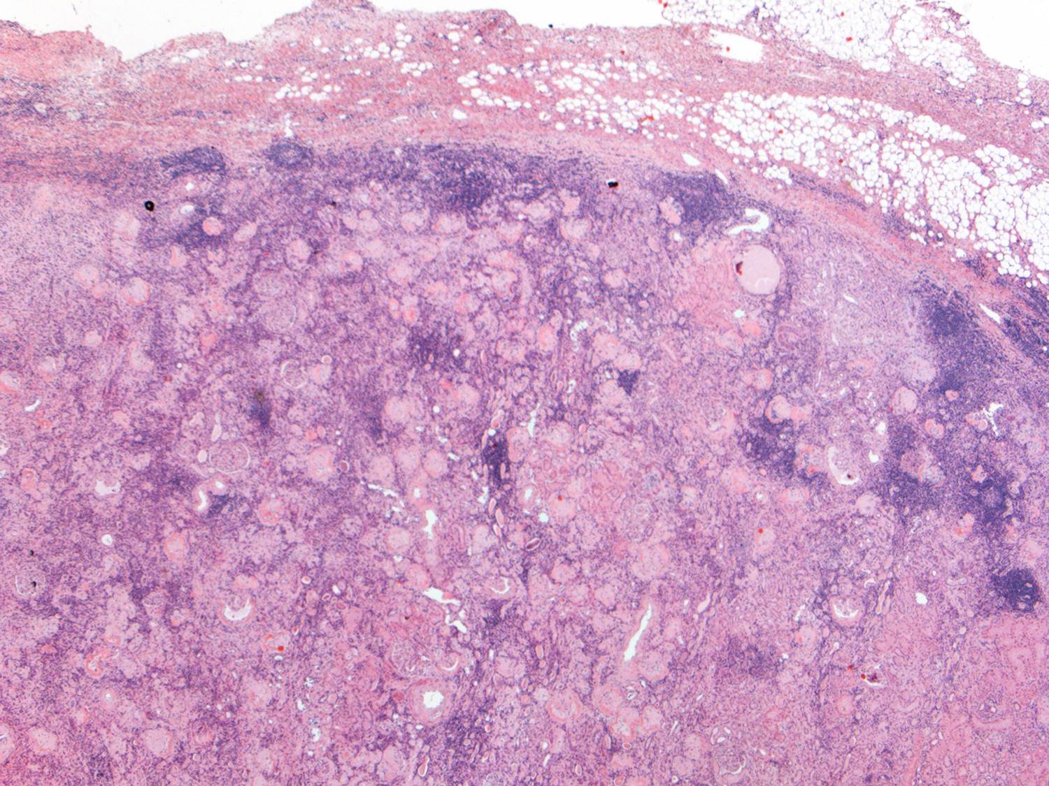 This is a low-power view of the renal cortex. There is diffuse global glomerulosclerosis involving approximately 80% of glomeruli. There is also significant tubular atrophy and interstitial fibrosis with associated areas of inflammation.