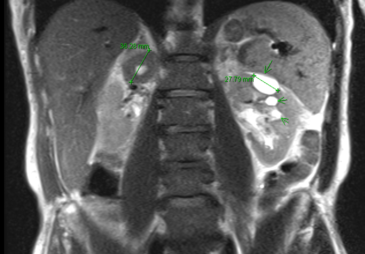The CT scan revealed a 5 x 2.2 cm mass lesion in the right renal/suprarenal region inseparable from the kidney and the right adrenal gland and the differential diagnosis was either a RCC or adrenal carcinoma. He then proceeded to an MRI abdomen.