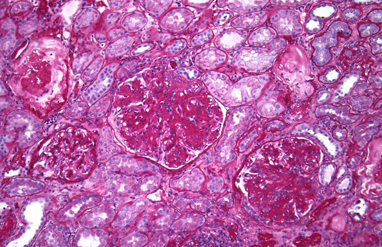 Higher power view of the preserved glomeruli revealed changes characteristic of diabetic nephropathy – nodular glomerulosclerosis.