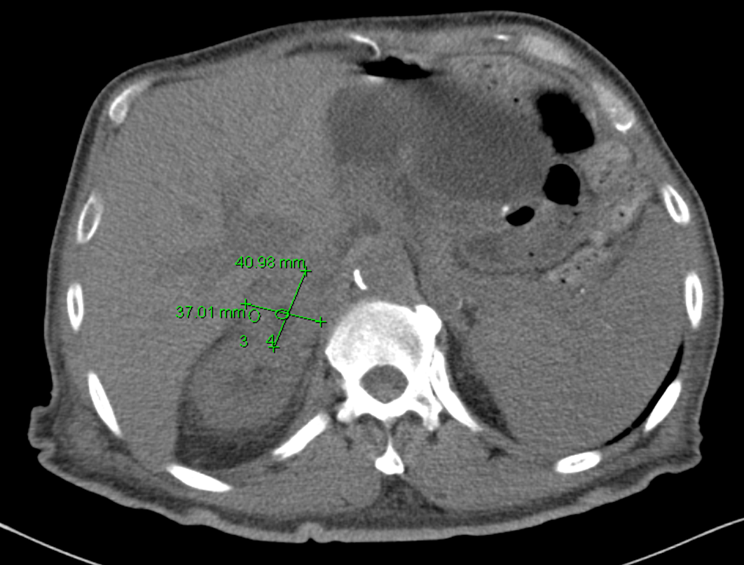 This again showed a mass in the right suprarenal region, inseparable from the right kidney and adrenal gland with some central necrosis. At this point, the decision was made to proceed with a partial nephrectomy for likely carcinoma.