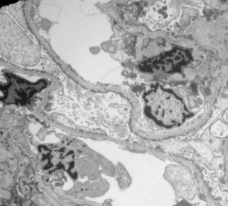 Her serum creatinine was 0.8 mg/dl and her albumin was 1.6 g/dl. Her serologies were entirely negative. The protein/creatinine ratio was 6 and 9 on two occasions. The presumptive diagnosis was IgA nephropathy and she proceeded to a renal biopsy.