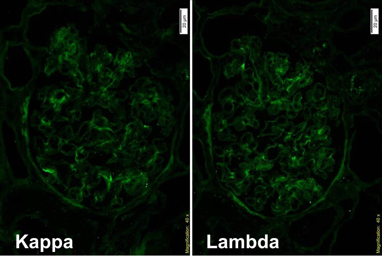 There was no staining for IgA. There was minimal IgG staining with equal kappa and lamda.