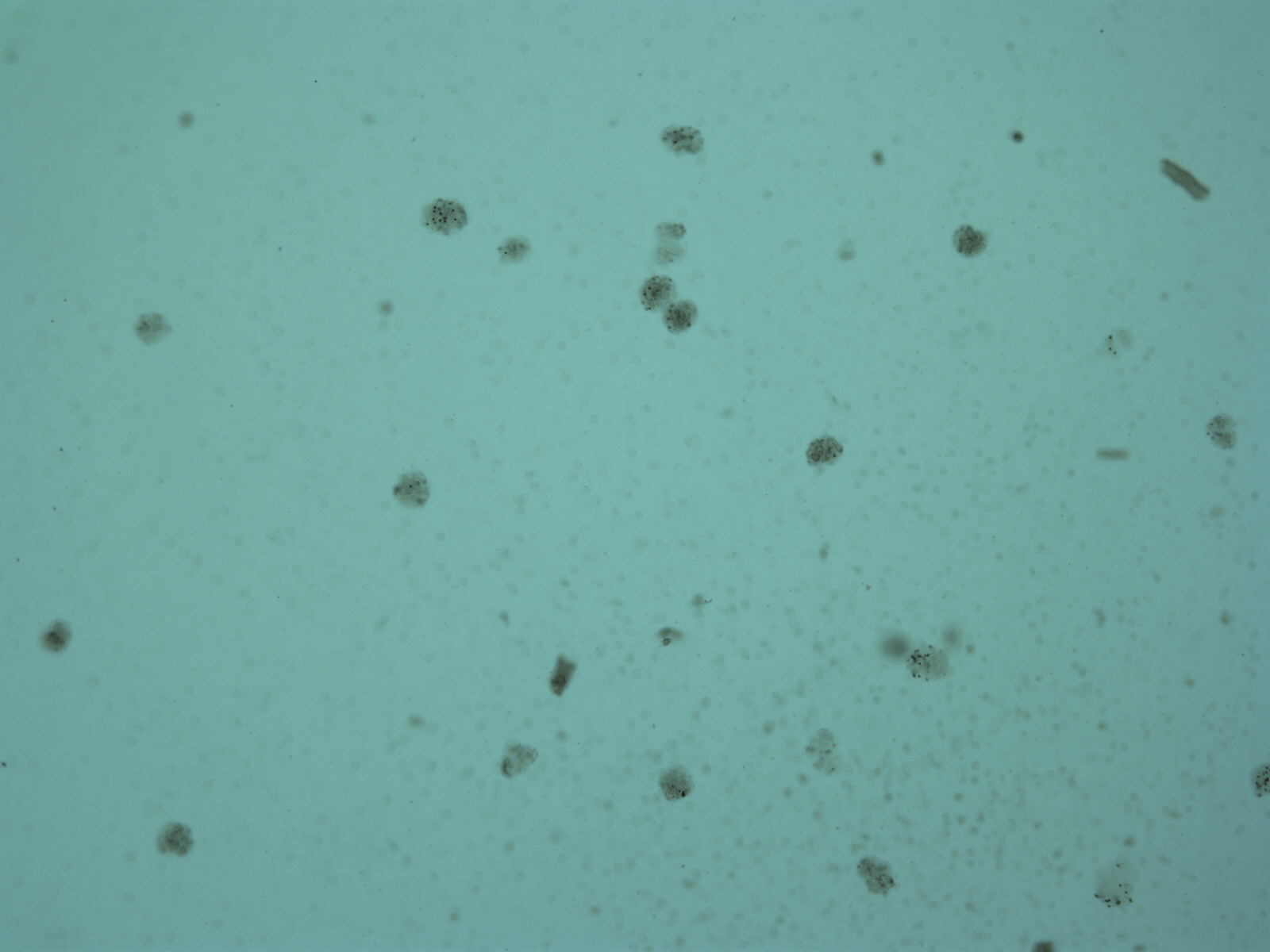 The picture below is a low-power view of the glomeruli following isolation. You can see that there is very little non-glomerular tissue present, which is remarkable given that the glomeruli make up such a small proportion of renal tissue.