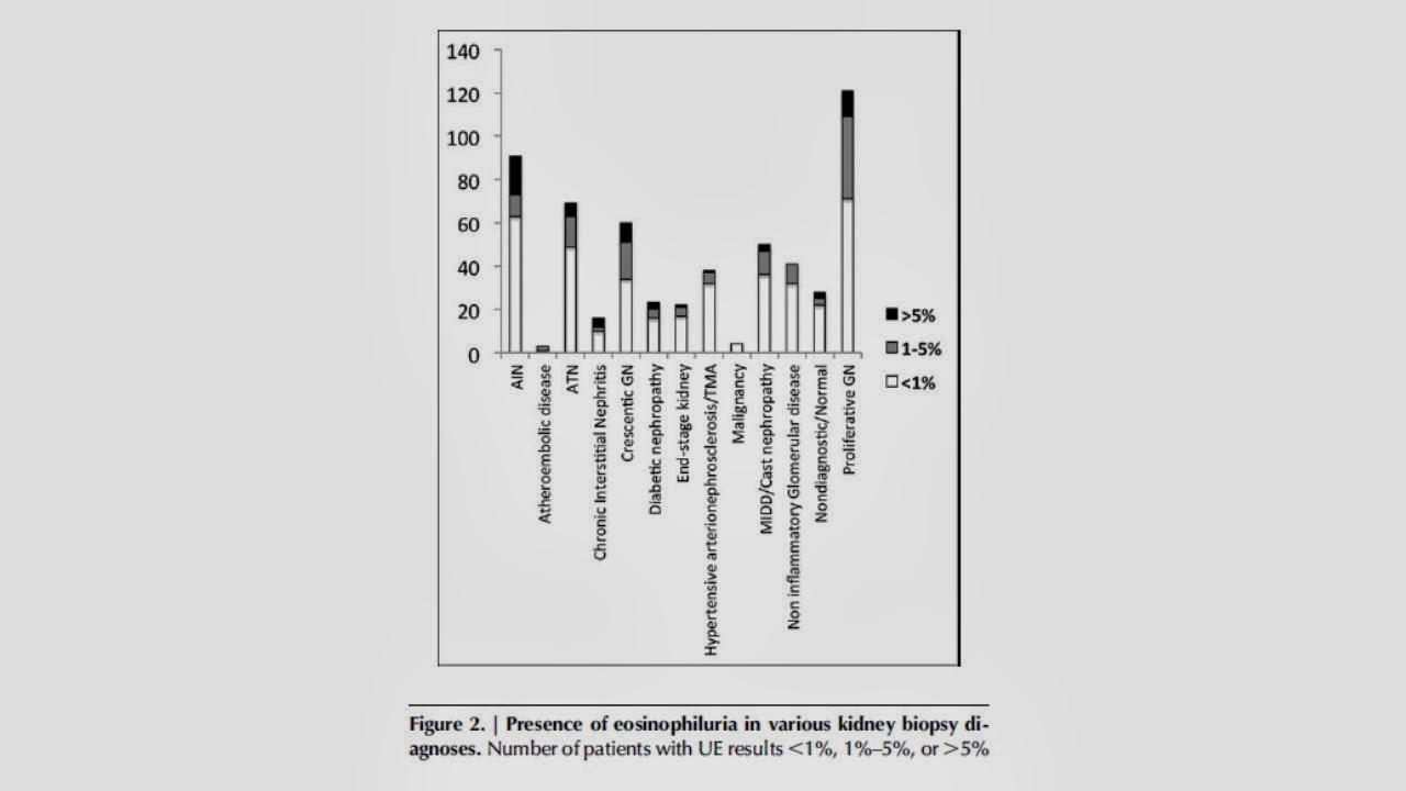 Notwithstanding this, the fact that the distribution of positive UE was so well distributed among the various diagnoses combined with the very low sensitivity of this test would suggest that the use of this test should no longer be routine in the diagnosis of AKI. At best, a negative test helps rule out AIN in patients with a low pre-test probability while a positive test is not particularly useful. As the authors of the accompanying editorial point out, even in drug-induced AIN, the infiltrate may not have a high proportion of eosinophils, suggesting that in many cases there may not even be a plausible biologic rationale for this test.