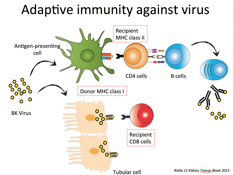 The conclusion was that an effective viral response requires cytotoxic T cells to kill infected cells (Figure above). Antibodies against the virus may help neutralize circulating virus but alone are not capable of stopping an ongoing infection. In particular, prior immunity against BK (IgG BK positive prior to transplant) does not seem to protect against post-transplant BK infection (different than CMV exposure). However, one must keep in mind that there are at least 4 different BK genotypes and immunity against one genotype does not equal immunity to all genotypes, which may explain some of the controversies on the topic (Pastrana et al. PLOS Pathogens 2012).