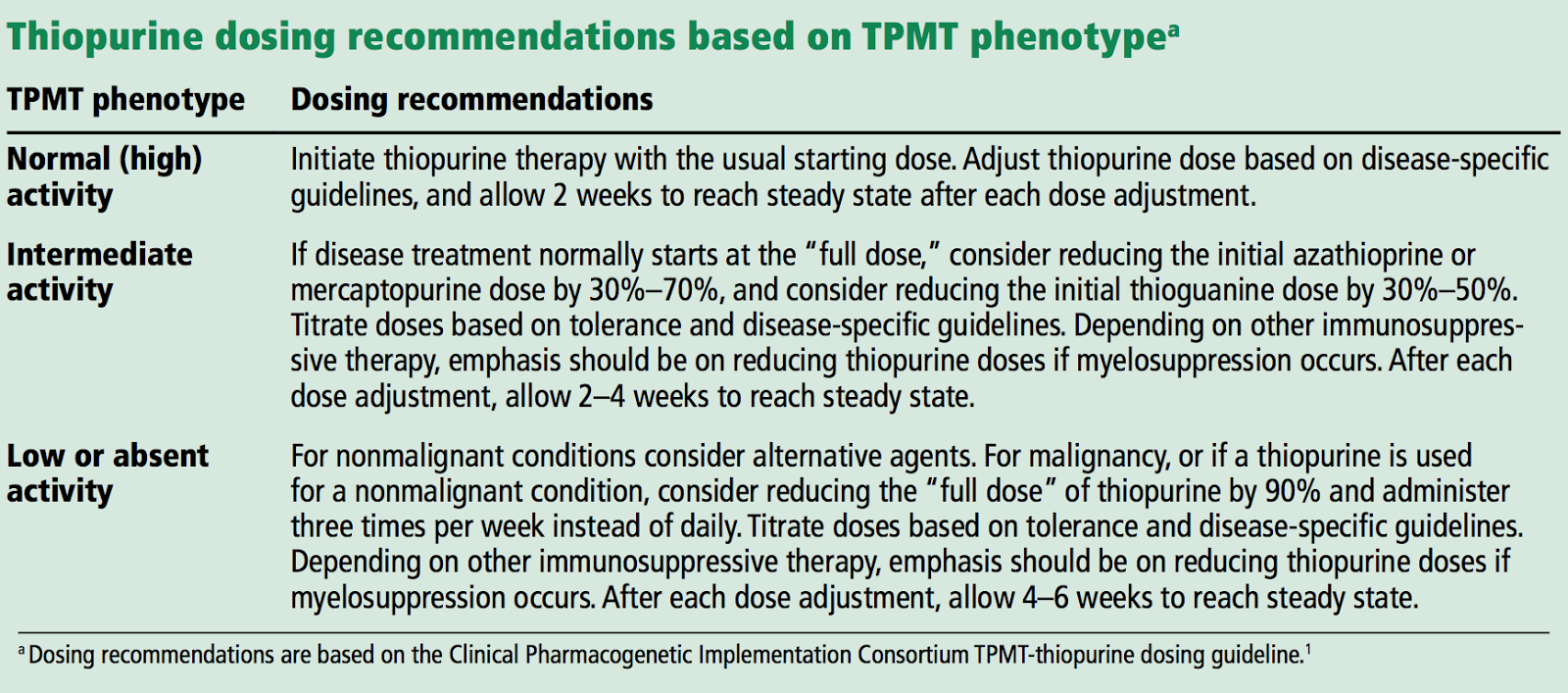 Clinical Pharmacogenetic Implementation Consortium (CPIC) has developed an evidence-based guideline on how to adjust thiopurine doses based on TPMT activity.