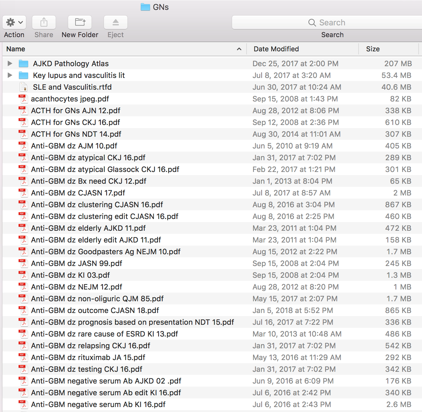 Another very well-organized way also was the method described by Dr. Roger Rodby from Rush University. Dr. Rodby uses a Google drive to organize and share (with his Fellows) his greater than 6000 articles. He keeps the Master PDF “Literature” Folder on his personal computer which syncs only one way to the Google drive (his computer’s Literature folder to the Google Drive’s Literature folder). By doing that he prevents anyone other than him from adding or deleting any articles to the PDF database. And also in doing so he can assure that the filing system and naming system stays intact. Dr. Rodby classifies subject headings into 39 somewhat arbitrary Nephrology topic folders: