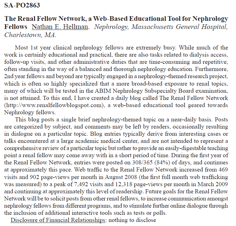 Hector Madariaga pointed out that Nate blogged about a long forgotten poster from ASN Renal Week 2009. Long before it was even called Kidney Week. I pulled up the abstract program from 2009 and found it. I recall going to his poster as I was an avid follower of RFN and a friend of Nate. However, this was well before phones were ubiquitous and I have no direct photo evidence of attending. Reading the abstract is impressive. A few things to note about this abstract. First, Nate blogged in 308/365 days in an entire year! I don’t believe this feat will ever be matched. Impressive! Second, the future section is very interesting and I believe Nate would be proud to see the website live on. Now in the 10th year of RFN let’s all cheers to Nate and another 10 years of RFN.