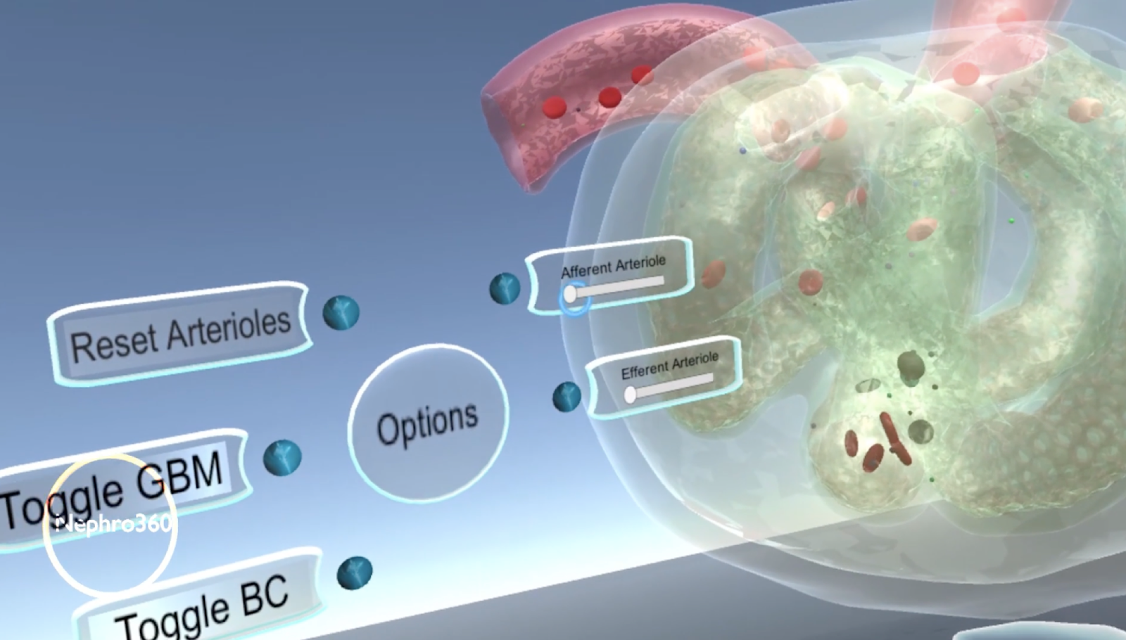 Nephro360 (click for a video) is a tool designed to teach the pre-clinical nephrology curriculum and improve student engagement and learning using gaming and virtual reality (VR) tools.