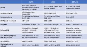 The first is ELAIN published in JAMA 2016. This was a single center randomized controlled trial conducted in Germany. It included 231 critically ill patients with KDIGO stage 2 AKI. There were two intervention groups: Early initiation of RRT (within 8 hours of KDIGO stage 2 AKI, n = 112) and delayed initiation (within 12 hours of KDIGO stage 3 AKI or no initiation, n = 119). Eligible patients were required to have NGAL >150 ng/ml and at least 1 of the following criteria: sepsis, fluid overload, worsening SOFA score, or vasoactive support. The modality of RRT was CRRT for all the patients. The primary end point was mortality at 90 days.
