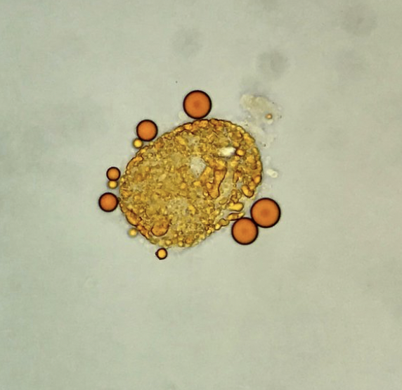 Oval fat body and free lipid droplets – Sudan III stain