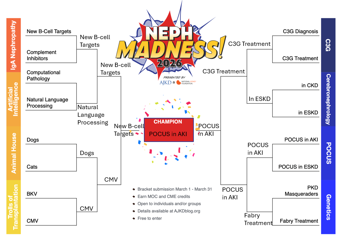 Read the “Scouting Report” posts on AJKD blog on each topic written by experts in the field that are an in-depth, referenced review of the topics. Then, decide which topic you think should move on to the next round. Still can’t decide? Flip a coin or try to predict how the Blue Ribbon Panel might vote. Take a look at our bracket above and how we got to our champion, POCUS in AKI. This year’s challengers are: